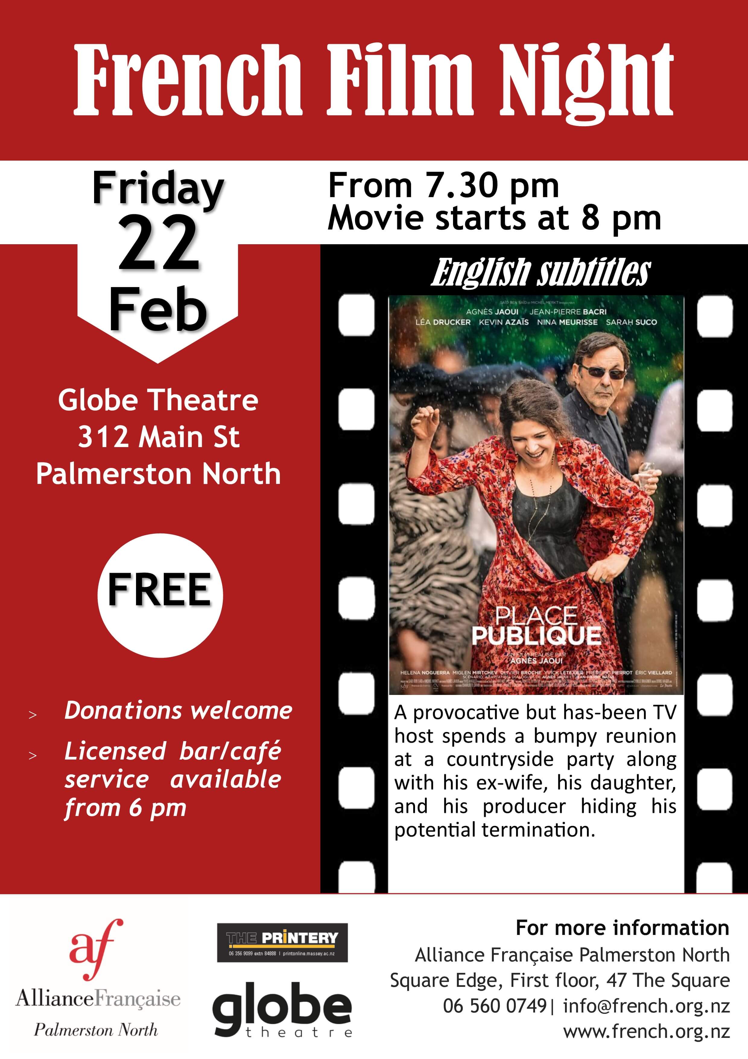 Street, Palmerston North 4410): the French movie "Place Publique" will be screened with English subtitles.
