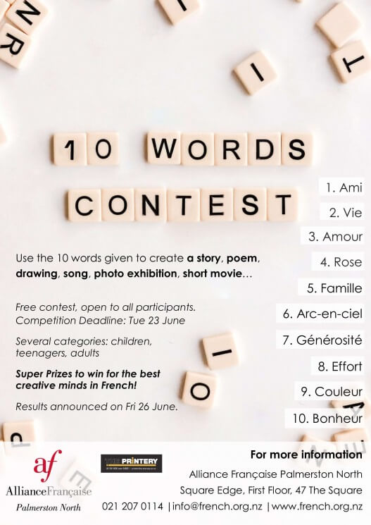 Use the 10 words given to create a story, poem, drawing, song, photo exhibition, short movie... and win one of our numerous prizes!