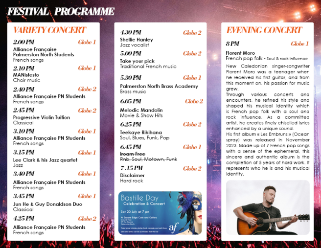 AND in the evening at 8 pm, don't miss the must-see concert given by our special guest: Florent Moro. A talented artist from New