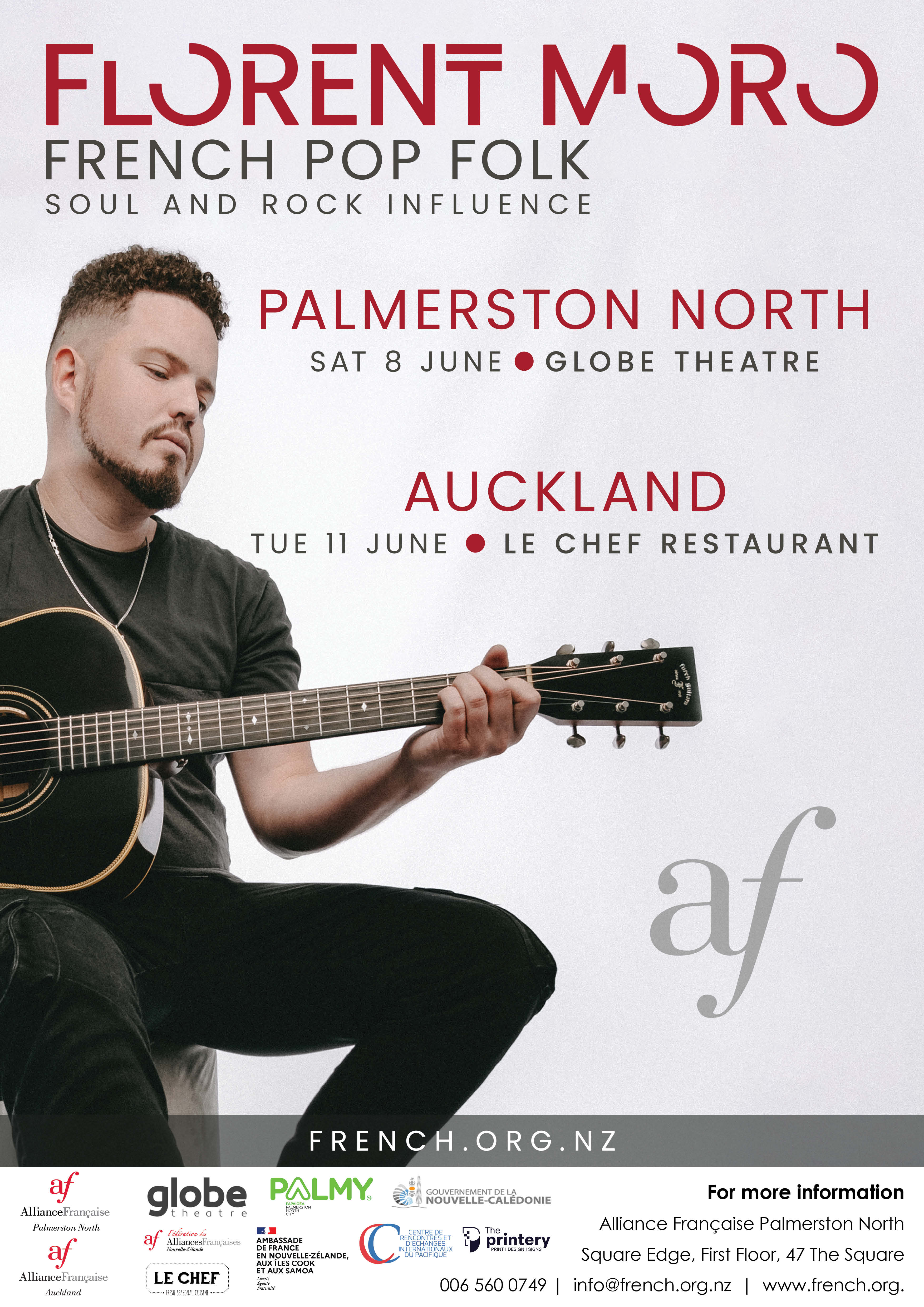 Alliance Française Palmerston North and Alliance Française Auckland are proud to present New Caledonian singer Florent Moro, who will