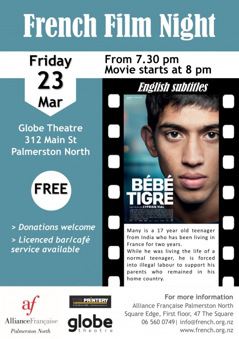 Join us at our French Film Night, on Friday 23 March at GLOBE THEATRE (312 Main Street, Palmerston North 4410): the French movie "Bébé Tigre" will be screened with English subtitles.