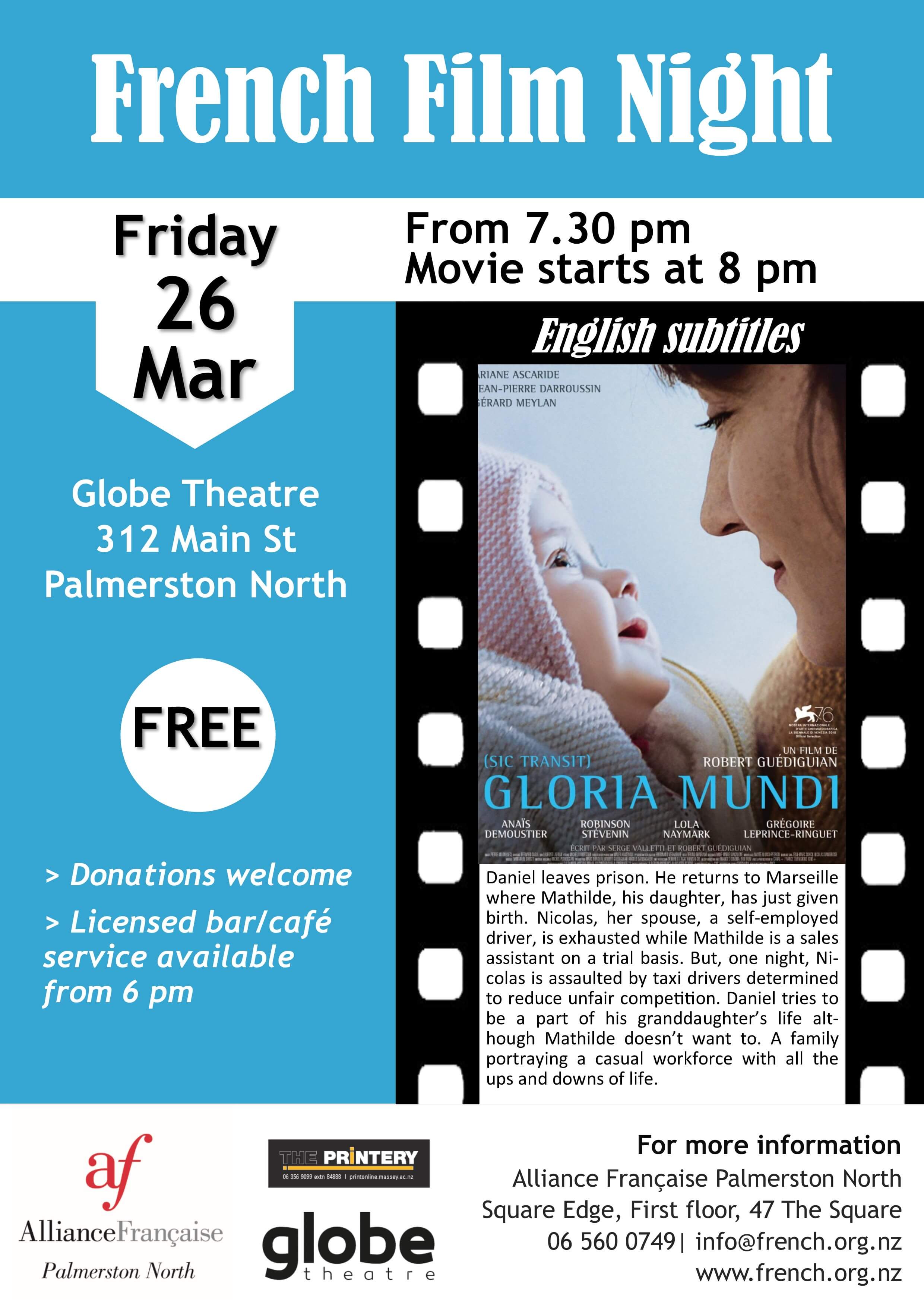 Join us on Friday 26 March @ The Globe Theatre (312 Main Street) for the screening of "Gloria Mundi" with English subtitles.