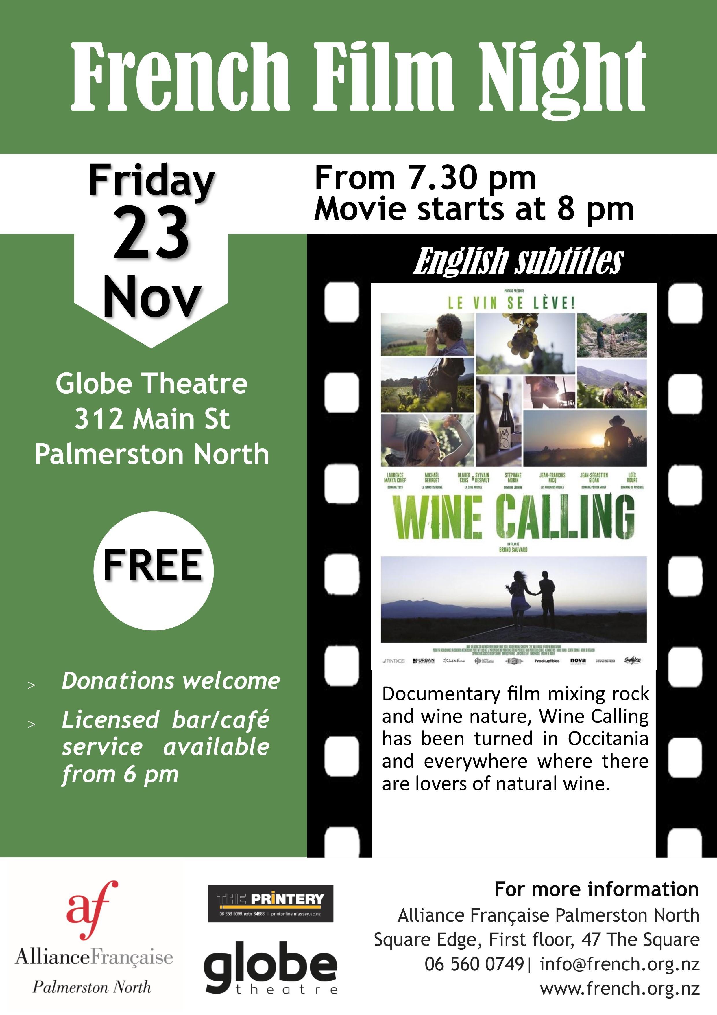 Main Street, Palmerston North 4410): the French movie "Le vin se lève!" aka Wine Calling will be screened with English subtitles.