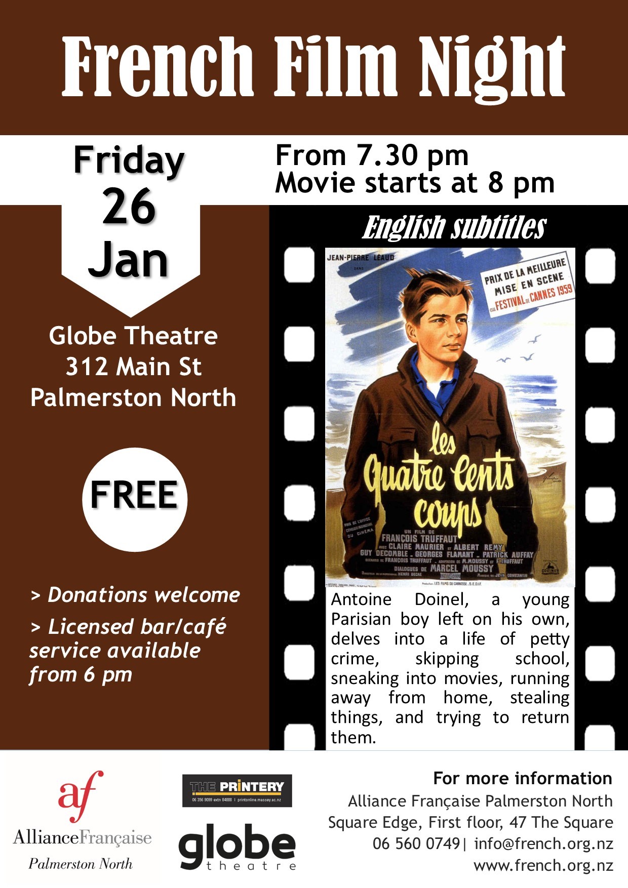 Join us for our monthly French Film Night on Friday 26 January at Globe Theatre.