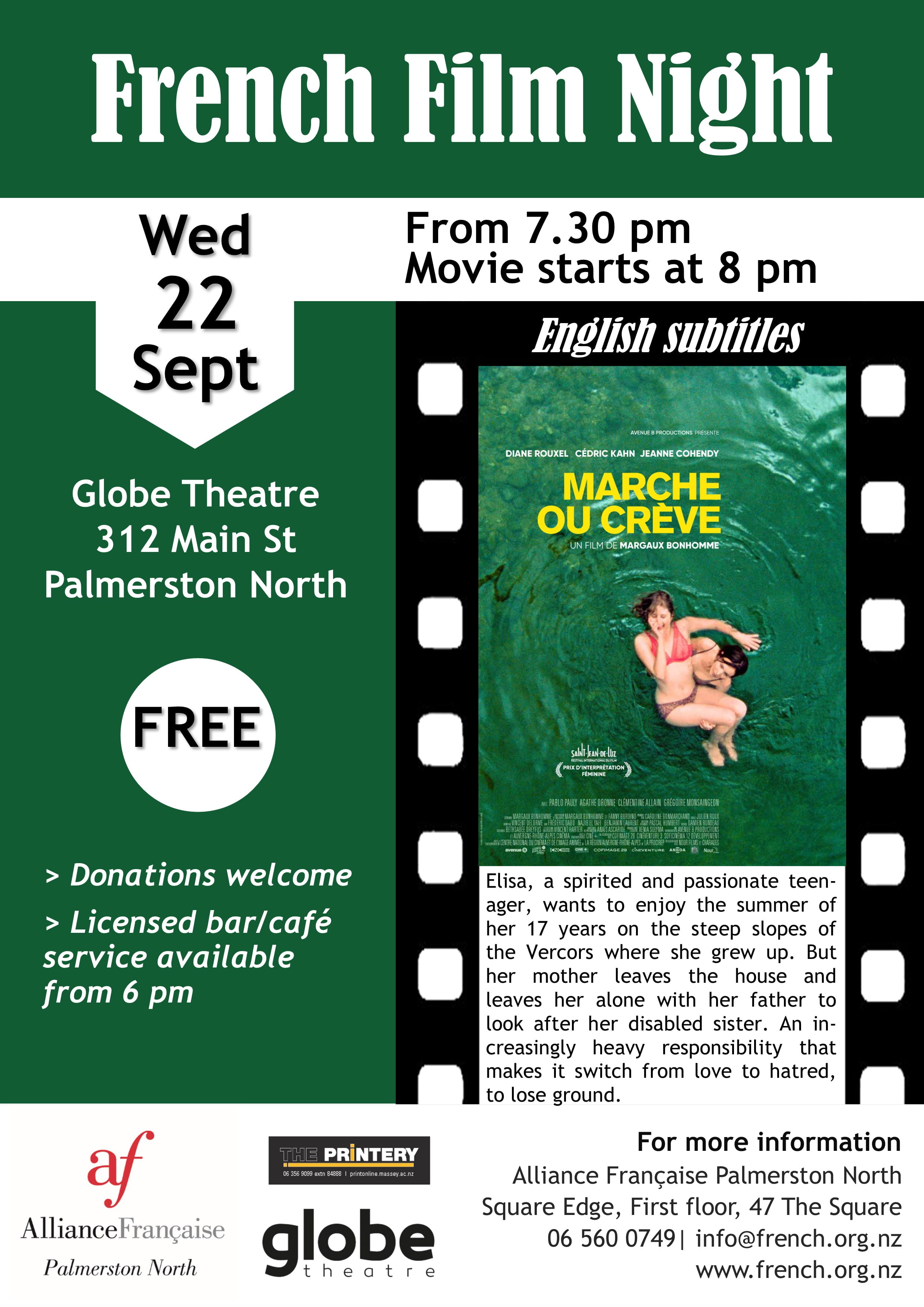 Street) from 7.30 pm for the screening of "Marche ou crève" with English subtitles.