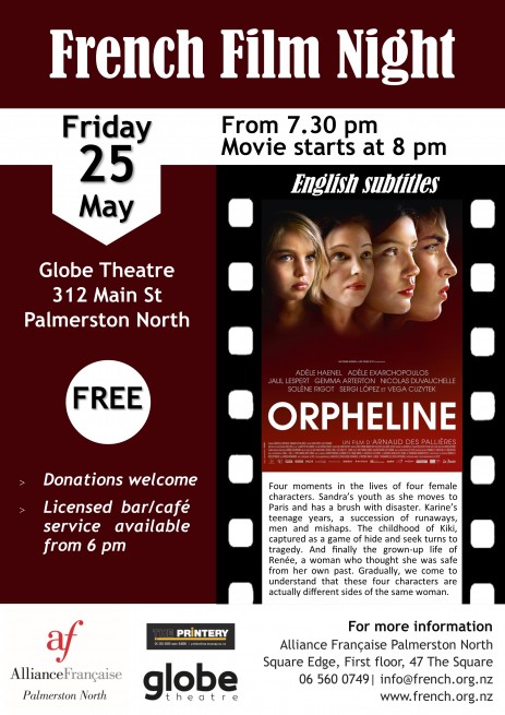 Join us at our monthly French Film Night, on Friday 25 May at the Globe Theatre, 312 Main Street, Palmerston North.