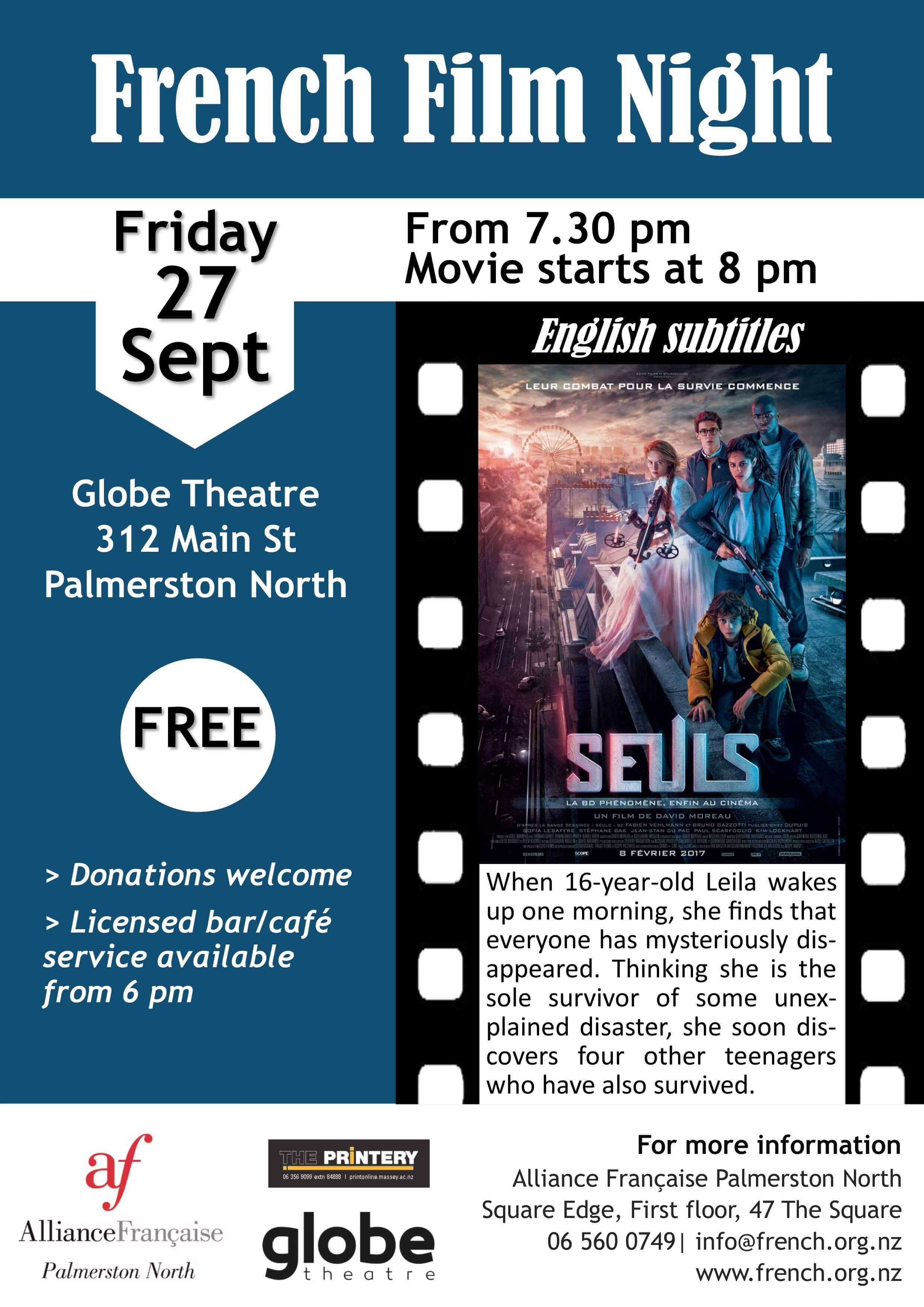 Join us for our monthly French Film Night with the free screening of the Sci-Fi movie Seuls with English subtitles. The film will be screened at The Globe Theatre (312 Main Street) on Friday 27 September at 8pm.