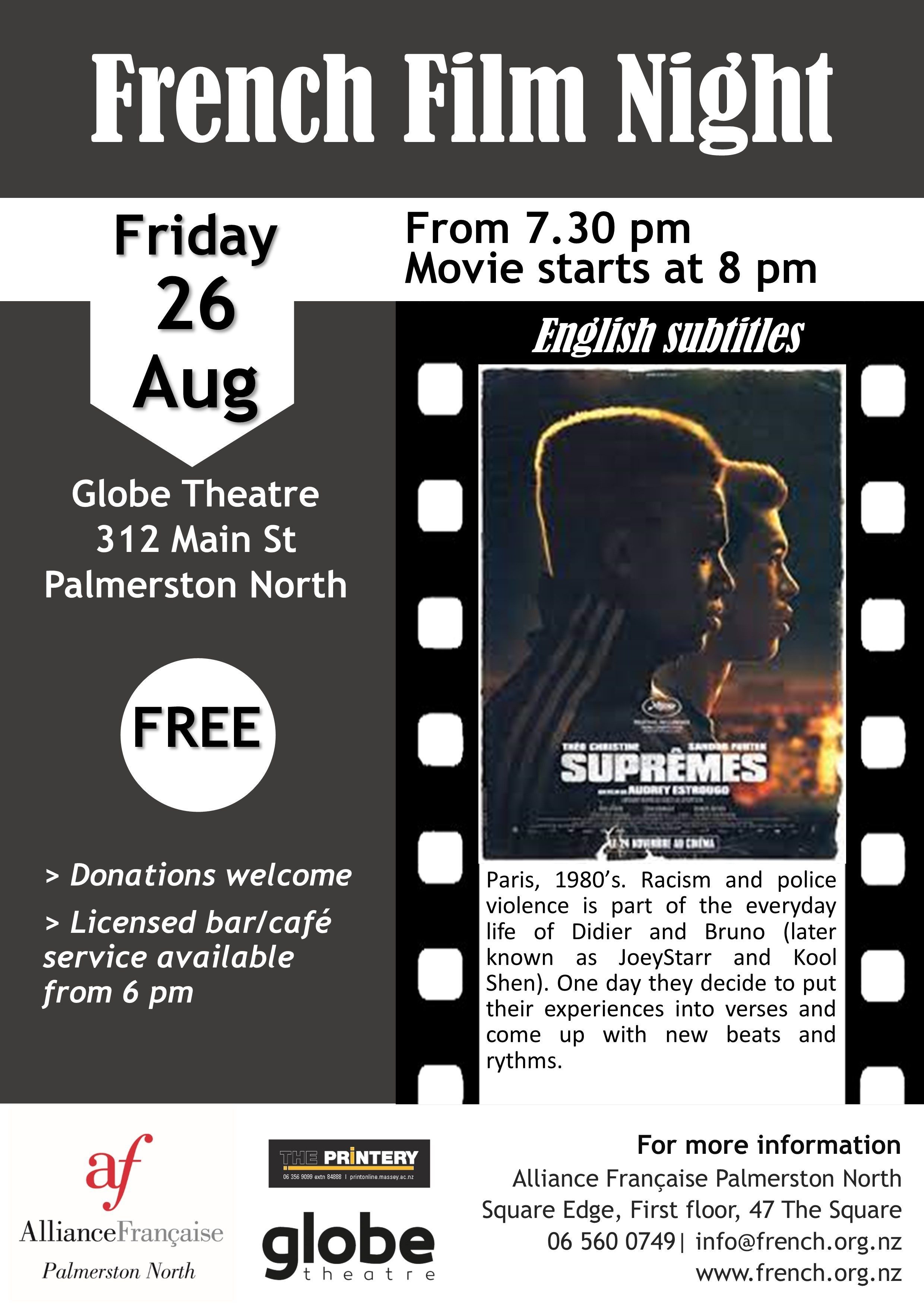 Join us for our monthly French Film Night on Friday 26 August at Globe Theatre.