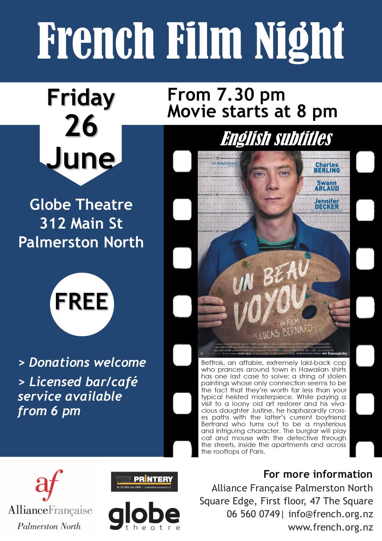 Join us for our monthly French Film Night at The Globe Theatre (312 Main St) on Friday 26 June.