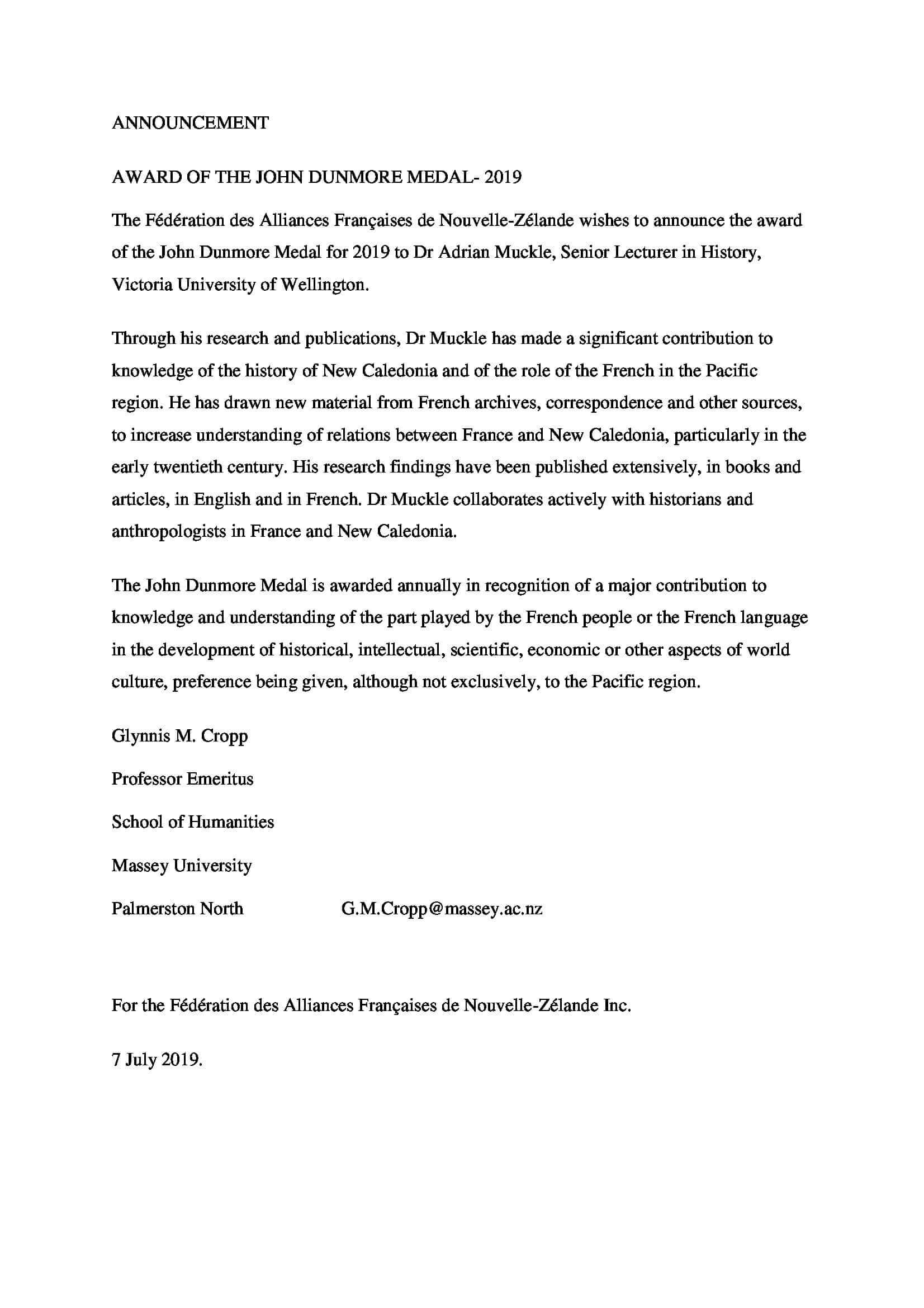 The Fédération des Alliances Françaises de Nouvelle-Zélande wishes to announce the award of the John Dunmore Medal for 2019 to Dr Adrian