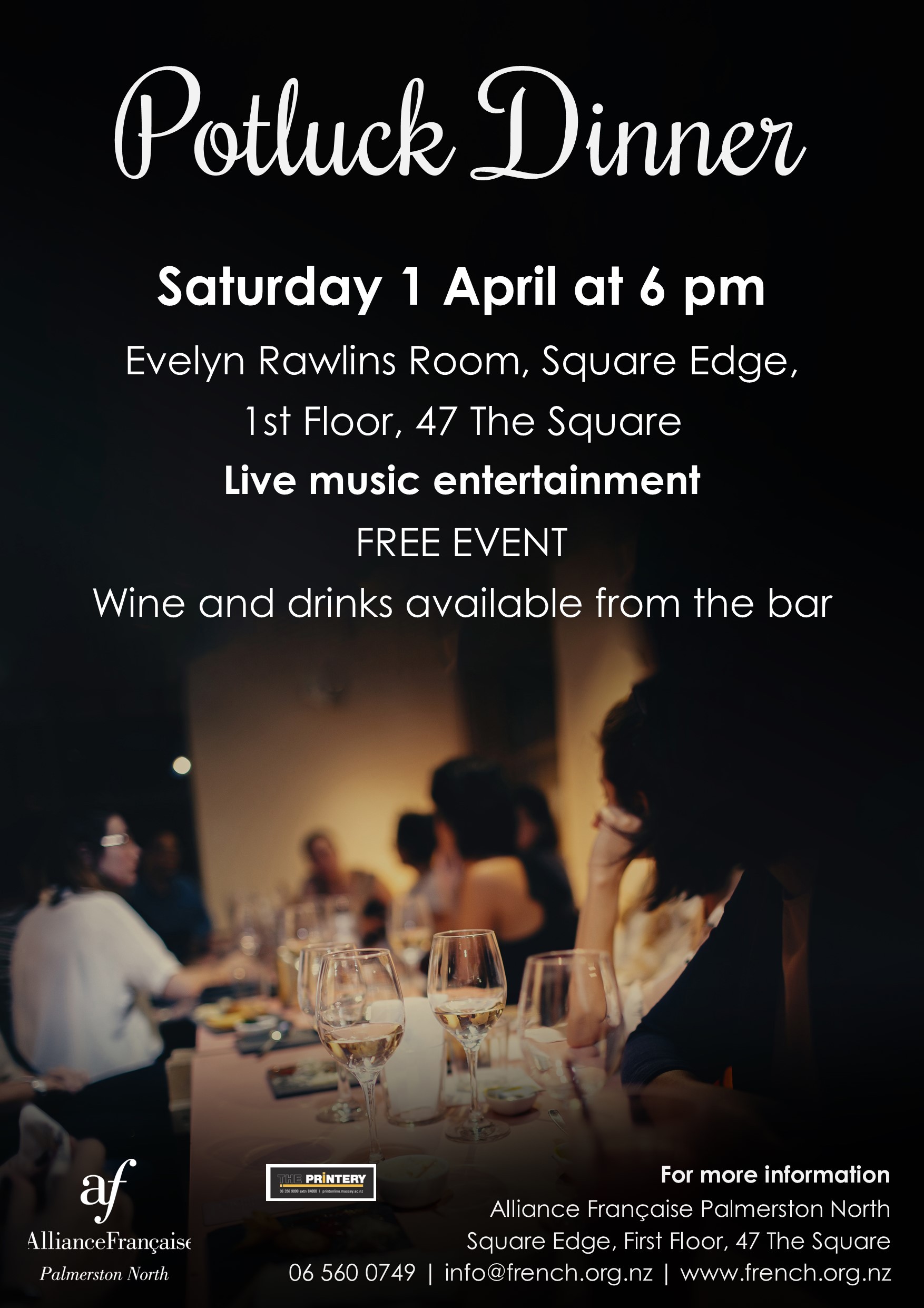 Take part in a convivial potluck dinner with live music entertainment at Alliance Française Palmerston North!