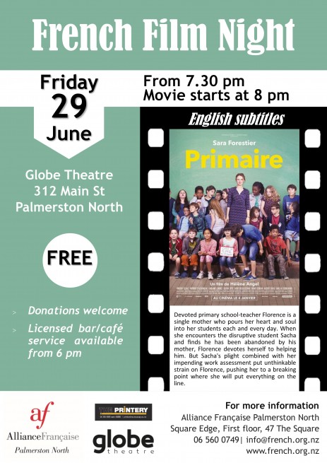 Join us at our monthly French Film Night, on Friday 29 June at the Globe Theatre, 312 Main Street, Palmerston North.