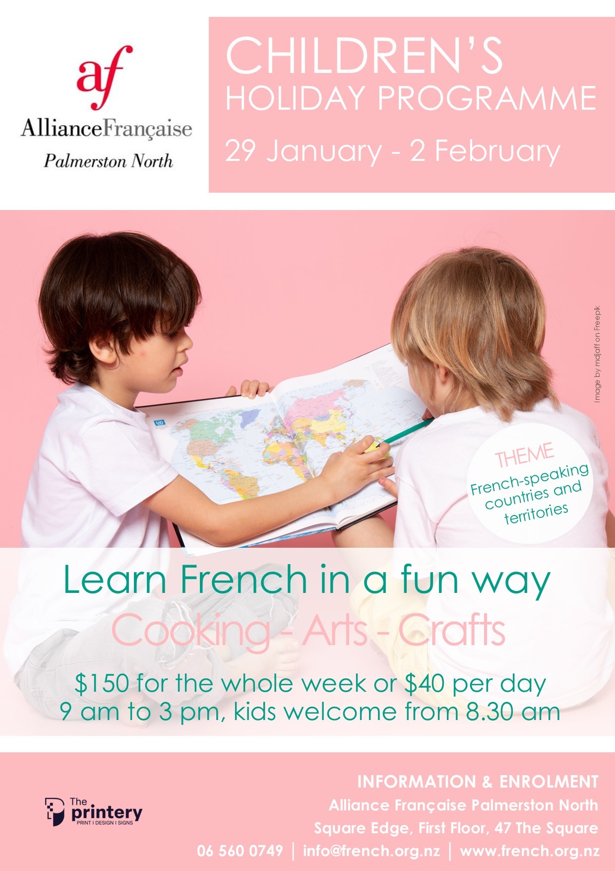 Activities run at the Alliance Française Palmerston North studio from 9 am to 3 pm. Children welcome from 8.30 am. Don't