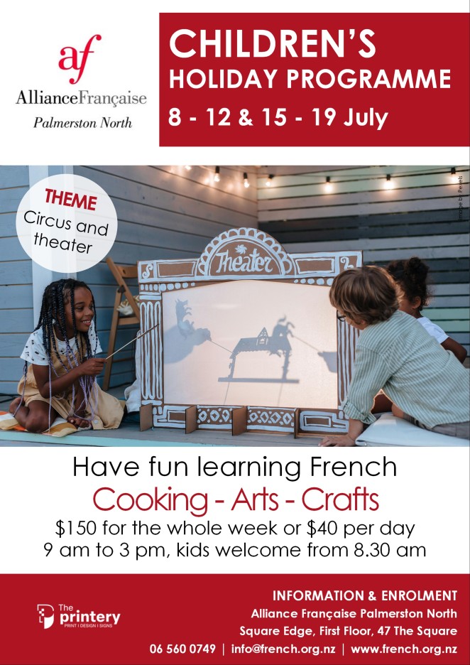 Activities run at the Alliance Française Palmerston North studio from 9 am to 3 pm. Children welcome from 8.30 am. Don't