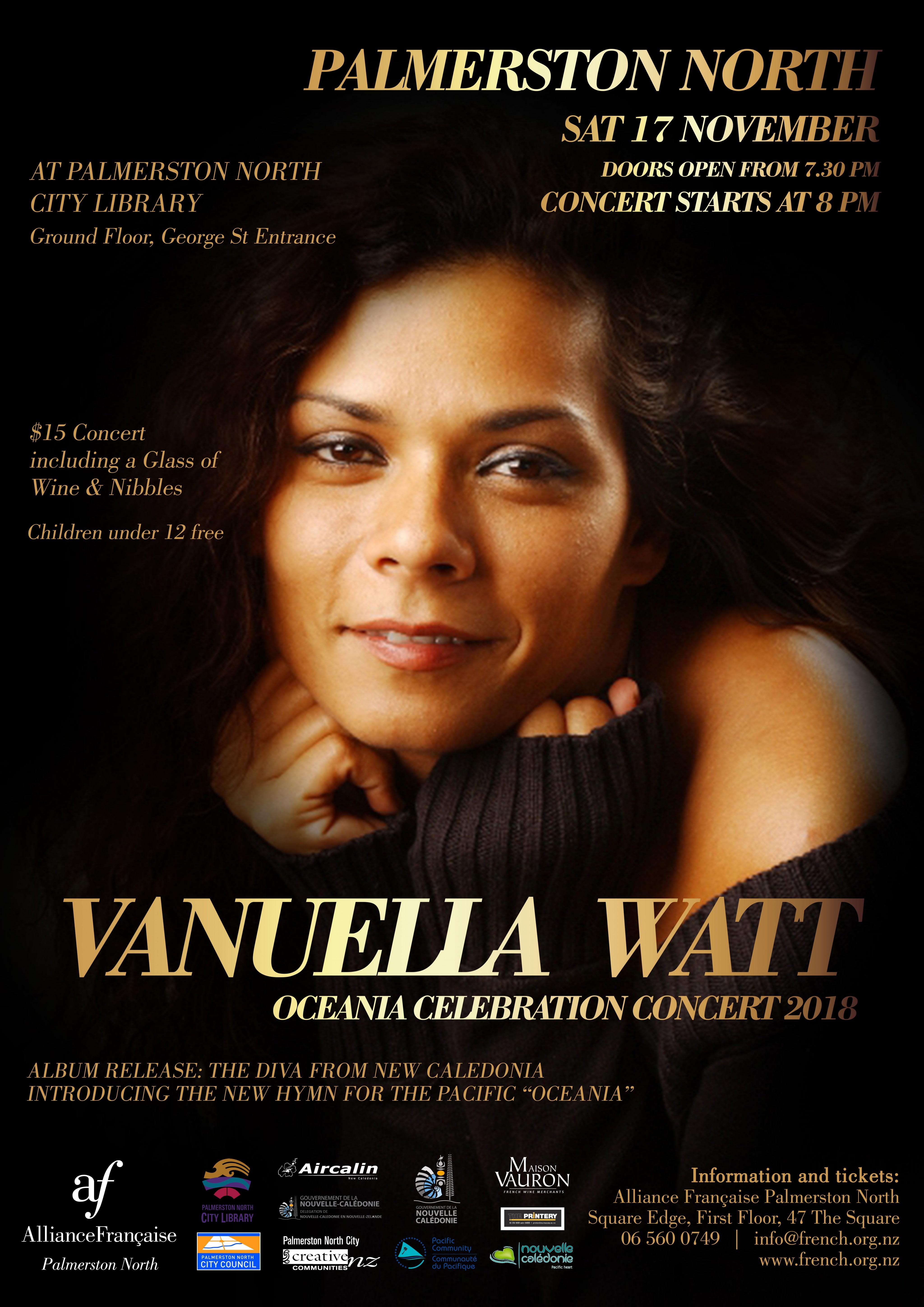 The Alliances Françaises of Auckland, Palmerston North, Nelson and Christchurch, together with the Government of New Caledonia, the Delegation of New Caledonia to New Zealand, the Pacific Community, Aircalin, New Caledonia Tourism and Maison Vauron Wine Merchants are proud to present New Caledonian singer Vanuella Watt, the ‘Pacific Diva’ who will be travelling to New Zealand from 14th to 24th November.